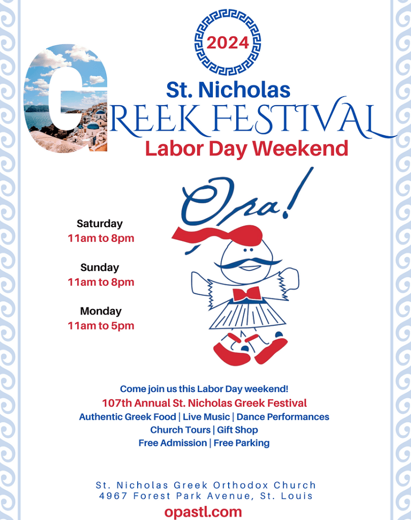 I attended the 107th Annual Labor Day Greek Festival during Labor Day weekend with my partner. The festival took place from August 31st to September 2nd. It was held at the St. Nicholas Orthodox Greek Orthodox Church in the Central West End neighborhood. The festival is held annually to celebrate Greek culture. The weekend was filled with authentic Greek food, live music, dance performances and church tours. The event was free and open to the entire community.