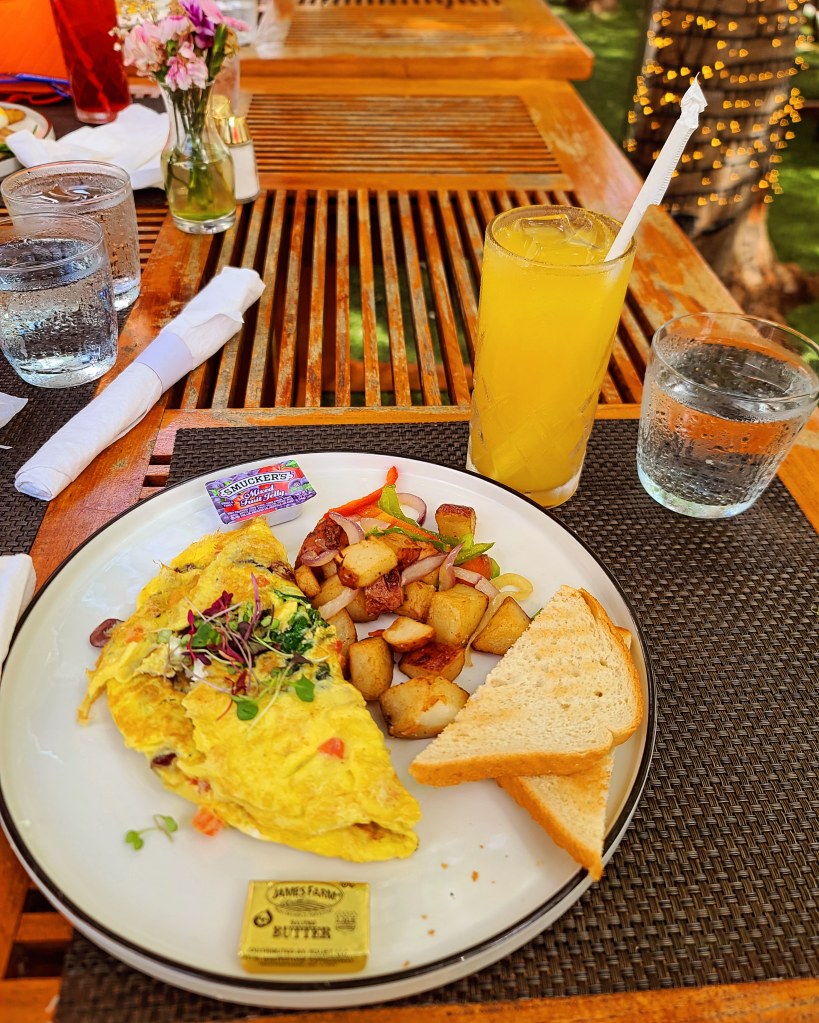 The following day, we got ready and headed to brunch. We chose a restaurant called Salt Cafe Miami Beach, with an outdoor seating area right by one of the busy streets. Here, we listened to music and people-watched while enjoying our meal. I ordered a delicious Mediterranean omelet and a glass of orange juice.
