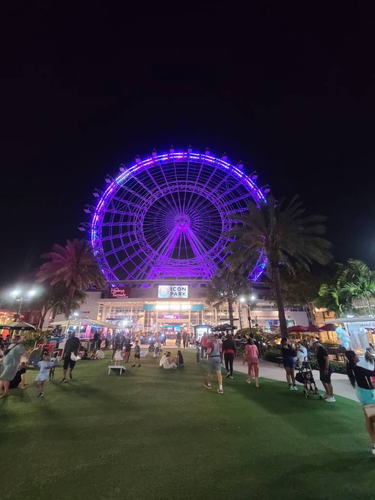 That night, we went to ICON Park. It has rides, restaurants, music, and shops. We started with the Ferris wheel, which gave us a nice view of the city. I love a good Ferris wheel. Afterward, we wandered around, listened to a DJ, browsed shops, and got some acai bowls before heading back to the hotel.